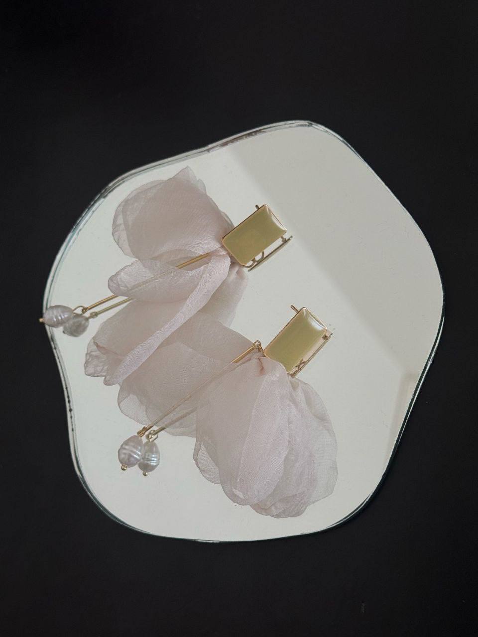 گوشواره میخی جذابمون ترکیبی از پارچه رنگ شیری و آویز مروارید